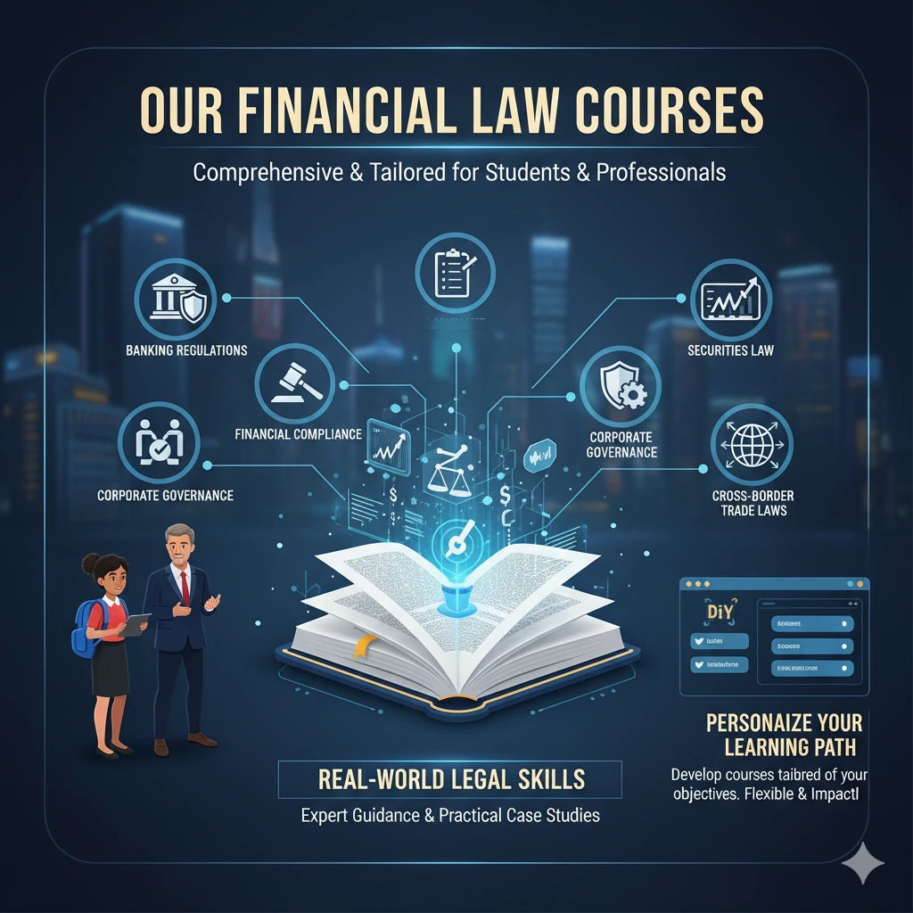 Our Financial Law courses are comprehensive and are designed for both students and professionals. They cover a wide range of topics, including banking regulations, financial compliance, securities law, corporate governance, and cross-border trade laws. Learners develop real-world legal skills to navigate complex financial systems and global commerce through expert guidance and practical case studies. Additionally, participants have the ability to personalize their learning path and develop courses (DIY) that are tailored to their professional or academic objectives, thereby guaranteeing a learning experience that is both flexible and impactful. You can explore the courses in the sub menu.